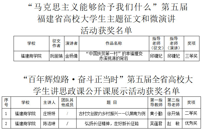 近日,《中共福建省委教育工委关于公布习近平新时代中国特色社会主义思想大学习领航计划系列主题活动获奖名单的通知》(闽委教思〔2022〕3号),MG冰球突破官网选送优秀作品参评省级公开课、微电影展示以及主题征文和微演讲活动,荣获二等奖1项,三等奖1项,优秀奖1项。