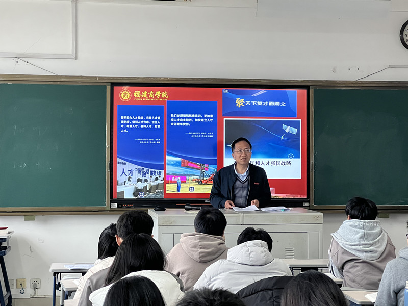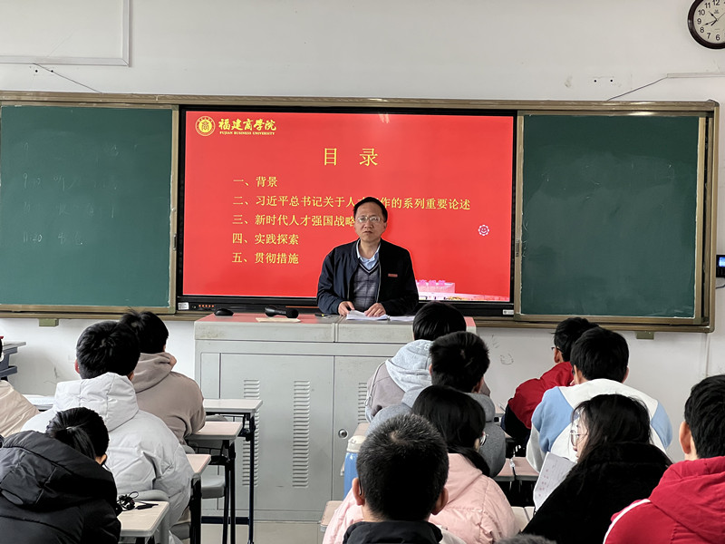 12月23日上午,为深入学习党的十九届六中全会精神,贯彻习近平总书记在中央人才工作会议上的重要讲话精神,康文杰副校长在连江校区诚信楼408为2020数据科学与大数据技术1班的学生做了一场题为“谱写新时代人才强国新篇章”的专题思政课。