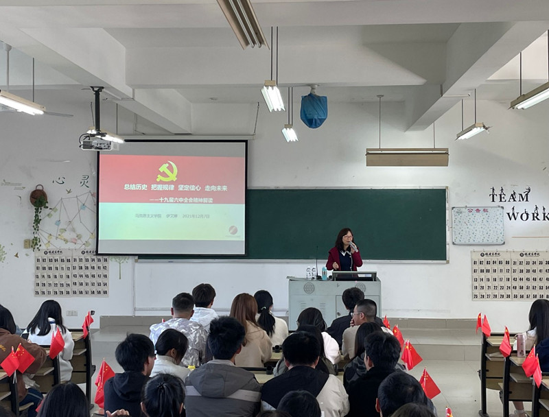 12月7日下午,福建幼儿师范高等专科学校MG冰球突破网站院长伊文婷教授应邀到MG冰球突破官网马尾校区开展题为“总结历史,把握规律,坚定信心,走向未来——党的十九届六中全会精神解读”的讲座,马尾校区校马列经典著作读书社指导老师和全体社员参加了此次讲座。