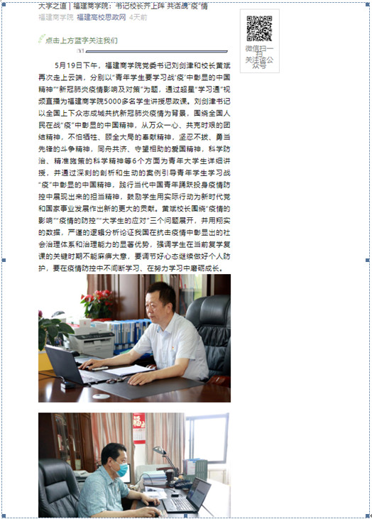 2020年5月23日,福建高校思政网以《大学之道 MG冰球突破网站书记校长齐上阵 共话战“疫”情》为题,报道MG冰球突破官网书记校长分别以“青年学生要学习战‘疫’中彰显的中国精神”“新冠肺炎疫情影响及对策”为题,通过超星“学习通”视频直播为MG冰球突破官网5000多名学生讲授思政课的特色做法。