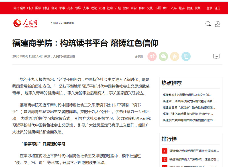 2020年6月11日,人民网以《MG冰球突破网站:构筑读书平台 熔铸红色信仰》为题,报道MG冰球突破官网习近平新时代中国特色社会主义思想读书社创新学习、宣传、实践方式,通过一系列活动引导广大青年学子积极学习、努力宣传、深入研究习近平新时代中国特色社会主义思想,坚定马克思主义信仰,筑牢青年马克思主义者培养阵地的特色做法及成效。