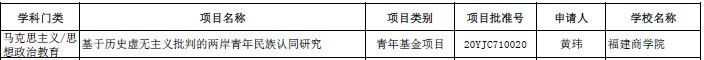 3月20日,根据《教育部社科司关于2020年度教育部人文社会科学研究一般项目立项的通知》,MG冰球突破官网MG冰球突破网站黄玮博士申请的“基于历史虚无主义批判的两岸青年民族认同研究”项目获2020年度教育部人文社会科学研究(青年基金项目)立项。这是MG冰球突破官网继2018年后再次获得教育部人文社会科学研究一般项目资助。