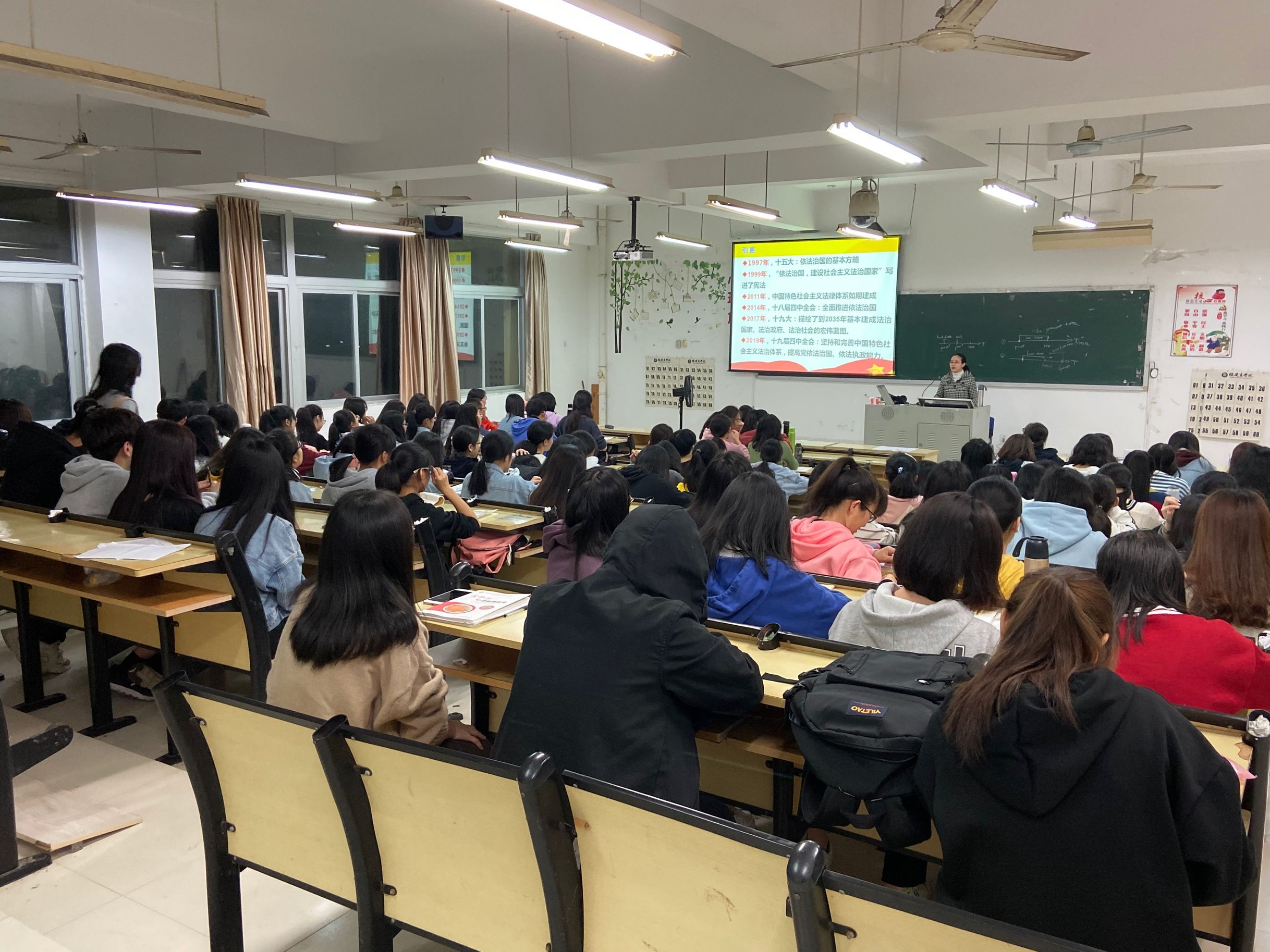 邱镛妃副教授以“法制”与“法治”、“人治”与“法治”的区别为切入点,阐述了法治的重要意义。在讲授中,邱镛妃副教授梳理了从党的十五大到党的十九届四中全会以来,我国依法治国的历史进程,强调坚定不移走中国特色社会主义法治道路;阐明了在推进依法治国过程中,必须要坚持党的领导和社会主义制度,将依法治国和以德治国相统一,构建起中国特色社会主义法治体系;深入剖析了“党大还是法大”这个伪命题。