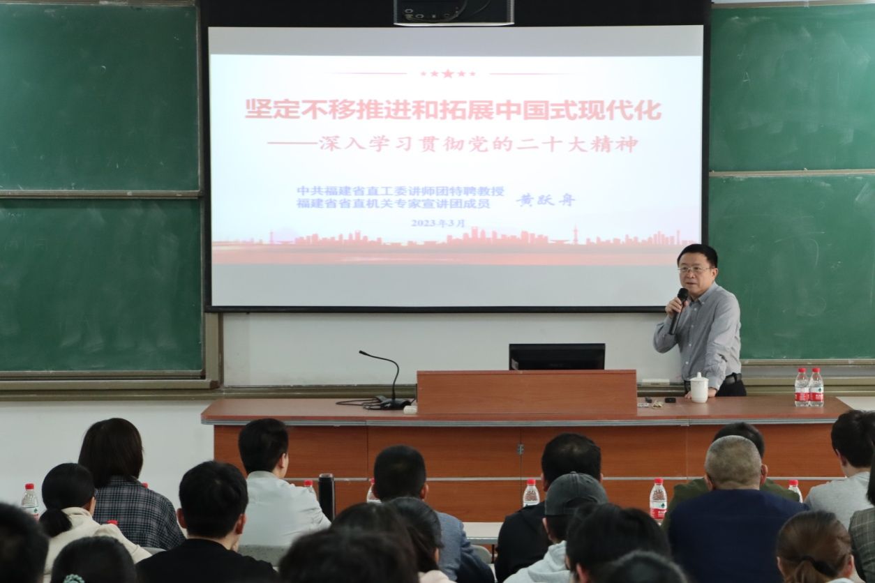 3月21日下午,中共福建省直工委讲师团特聘教授、省直机关专家宣讲团成员黄跃舟应邀到MG冰球突破官网开展“坚定不移推进和拓展中国式现代化——深入学习贯彻党的二十大精神”专题讲座。MG冰球突破网站部分教师、连江校区“青马”班部分学员、校习近平新时代中国特色社会主义思想读书社部分社员参加学习。