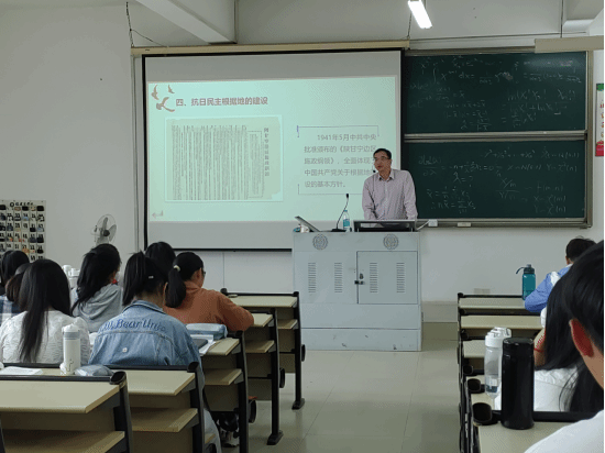 蒲副校长从“抗日民主根据地的建设”等三个方面论述了中国共产党在抗日过程中发挥的历史性作用。他指出,在抗日民主根据地的建设中,中国共产党根据地,在政权上实行“三三制”原则;经济上停止实行没收地主土地的政策,普遍实行减租减息政策;文化上加大干部教育等,这些做法大大扩大了根据地在人民群众心目中的影响力,出现了“中国的希望在延安”的欣欣向荣的景象。另一方面,为坚定不移践行全民统一战线,中国共产党在国民党统治区开展了抗日民主运动,扎实推进抗战文化工作全面而深入的发展。最后,他指出党的自身建设是党发挥中流砥柱作用的内在要求。