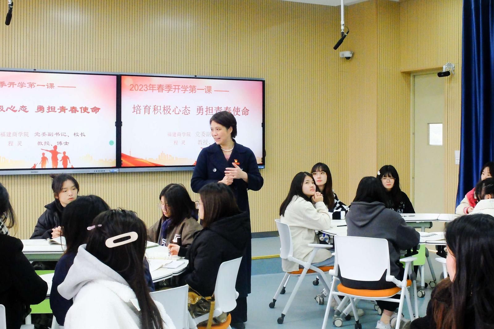书记校长进课堂开讲 “开学第一课”。新学期,学校党委书记、校长带头为师生上“开学第一课”,宣讲党的二十大精神,深情寄语,引导学生扣好“人生第一粒扣子”。结合学习贯彻党的二十大精神以及落实全省“深学争优、敢为争先、实干争效”行动,用翔实的数据、具体的案例分析党的二十大报告概括的新时代十年党和国家事业取得的历史性成就、发生的历史性变革,勉励广大师生要坚定不移听党话、跟党走,怀抱梦想又脚踏实地,敢想敢为又善作善成,鼓励同学们在面对各种社会思潮的影响时要更加自信自强、富于思辨精神,立志做一个有理想、敢担当、能吃苦、肯奋斗的新时代好青年。