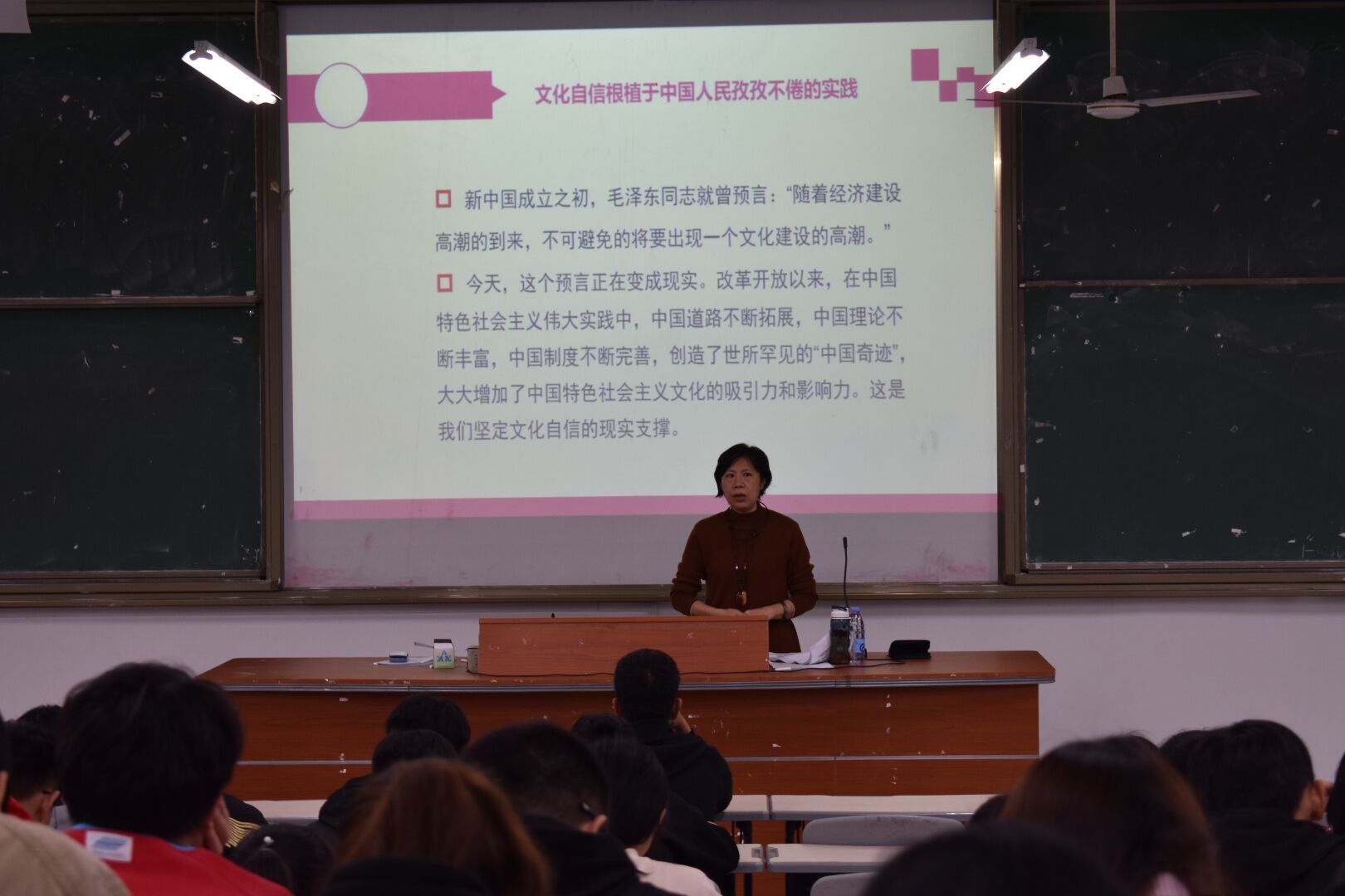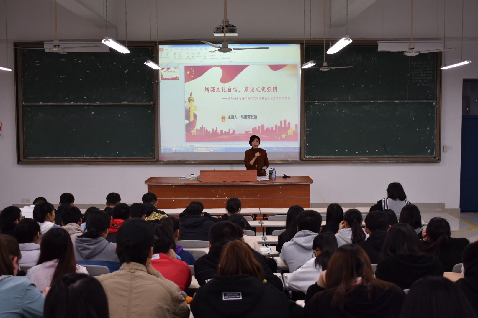 陈用芳教授从“文化自信是更基本、更深沉、更持久的力量”、“坚持用社会主义核心价值观凝心聚力”、“推动中华优秀传统文化创造性转化、创造性发展”、“提升文化软实力,建设文化强国”四个方面,为在场同学阐释了增强文化自信,建设文化强国的重大意义与深远影响。讲座过程中,陈教授列举2003年的非典事件、“杂交水稻之父”袁隆平等感人例子,并引用习近平总书记话语“不忘本来才能开辟未来,善于继承才能更好创新”高度赞扬了新时代的中国精神;她指出,习近平新时代中国特色社会主义思想是新时代坚定文化自信、推动社会主义文化繁荣兴盛、建设社会主义文化强国的理论武器和科学指南。