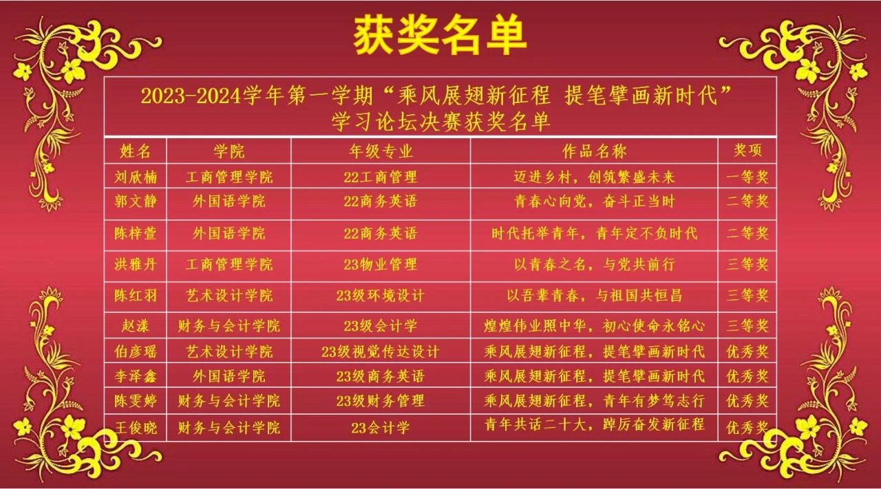 2023年12月5日下午,校习近平新时代中国特色社会主义思想读书社、校马列经典著作读书社在连江校区诚信楼中阶三教室举办了“乘风展翅新征程 提笔擘画新时代”主题学习论坛决赛。MG冰球突破网站部分教师及校读书社社员逾200人参与了此次活动。